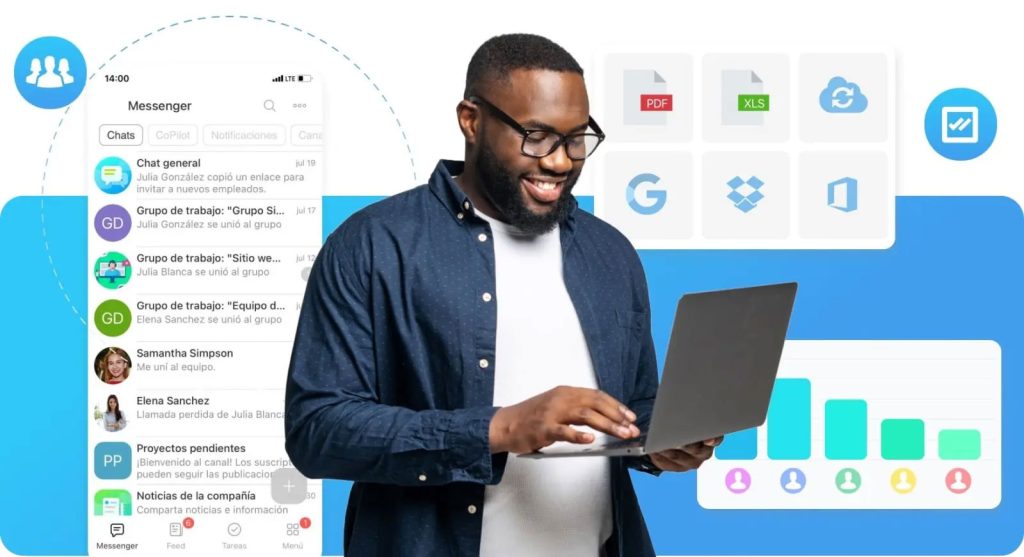 Oficina virtual integral con herramientas de comunicación, colaboración y gestión empresarial, incluyendo intranet, videoconferencias, almacenamiento, gestión de documentos y tareas. Además, cuenta con un sistema de gestión de recursos humanos con control de asistencia, informes, automatización y dirección.