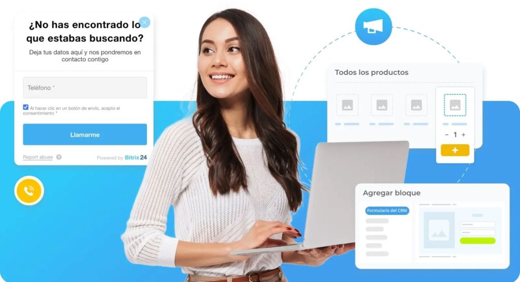 Crea sitios web, landing pages y tiendas en línea sin necesidad de programar, con un diseño atractivo e integración automática con herramientas de marketing y CRM. Bitrix24 es la única plataforma que combina un creador de sitios web con alojamiento incluido, canales de contacto, formularios web y un potente software de comercio electrónico para gestionar catálogos, pedidos, inventarios, productos, paquetes, descuentos, SKUs e impuestos, optimizando así la administración.
